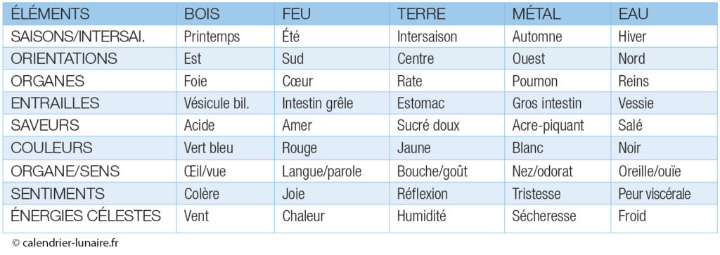 La civilisation chinoise considère que l’être humain est relié à l’univers. Cela implique des échanges d’énergie, appelés Qi (prononcer tchi). Les saisons ont une influence sur la qualité du Qi. La loi des cinq éléments (bois, feu, terre, métal, eau) et tout ce qui s’y trouve relié est une base de la culture et de la médecine chinoises. (Voir tableau ci-après). La médecine chinoise accorde une priorité au traitement préventif en tenant compte des rythmes et des processus énergétiques. En effet, en intervenant au moment approprié sur les zones de fragilité de chacun, l’efficacité se trouve augmentée.